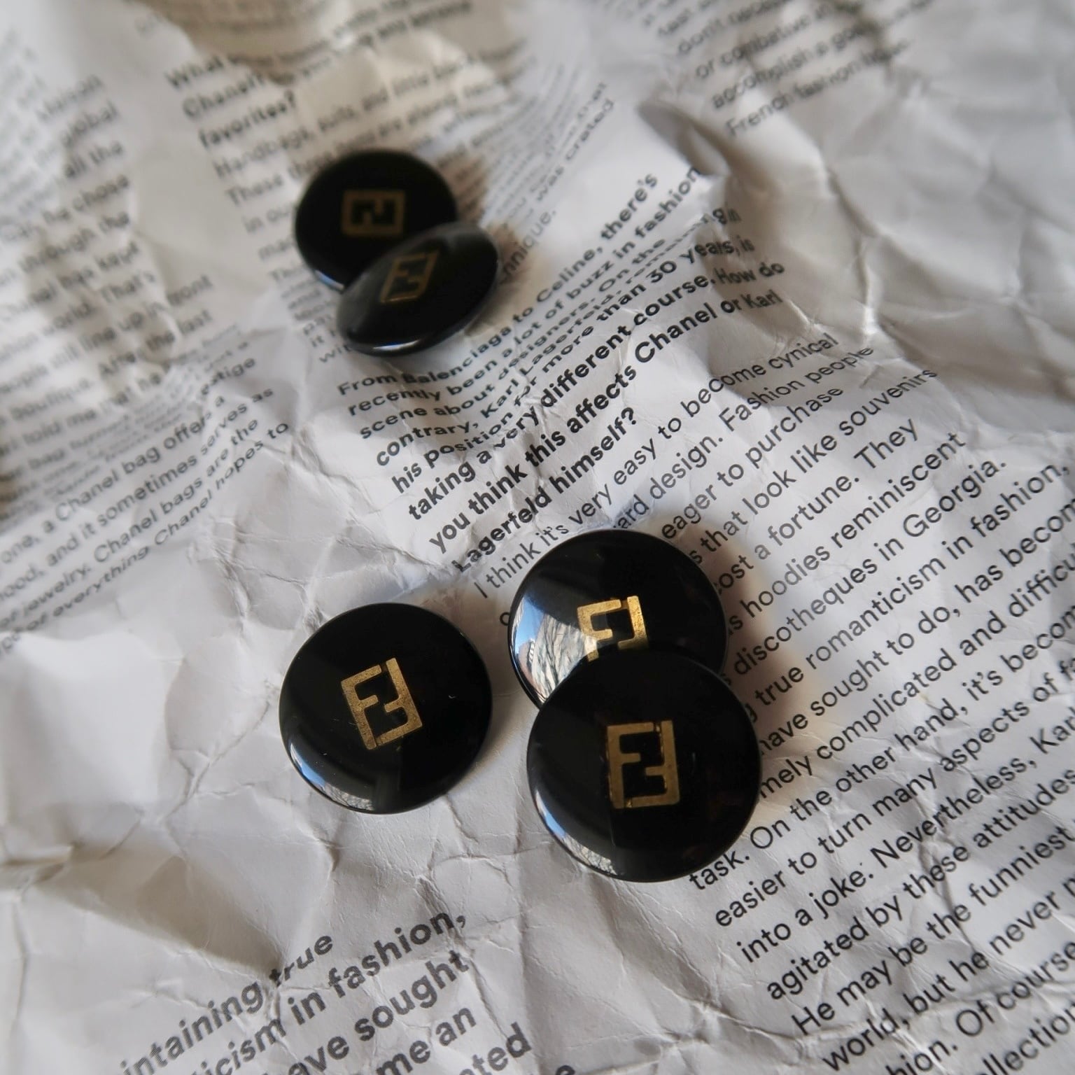 艶のあるボタンにゴールドのプリントロゴが埋め込まれたデザイン。
